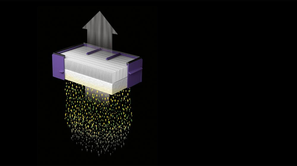 The HEPA filter removes airborne particles from the air. It has a grille to capture larger debris, a fleece layer to capture fluff and fibres, and a pleated HEPA media to capture paricles as small as 0.3 microns.2